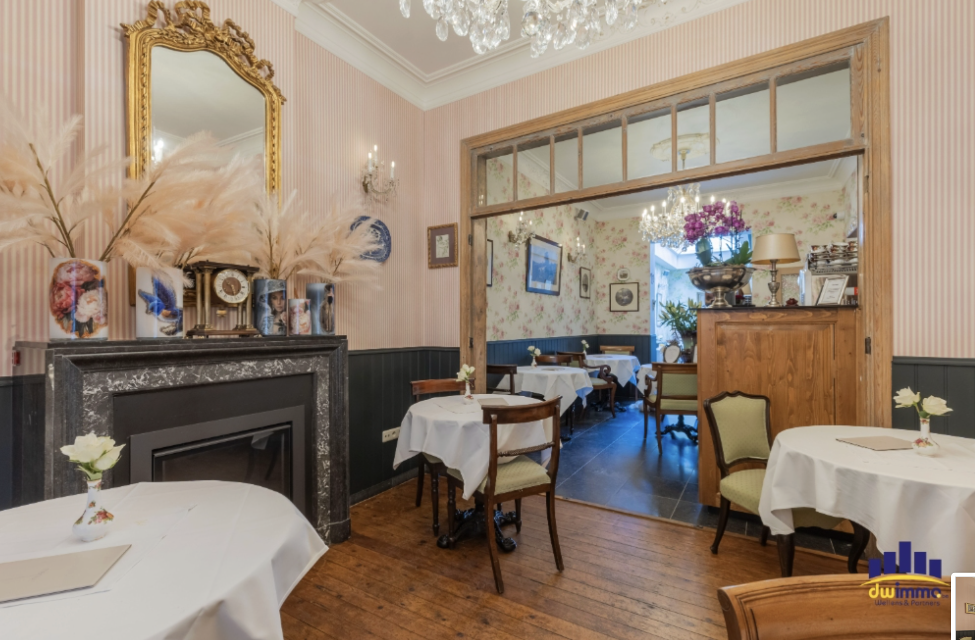 Op het gelijkvloers bevindt zich een sfeervolle theeroom, ideaal om direct uit te baten of in te richten als gezellige handels- of ontmoetingsruimte. De warme uitstraling en charmante details creëren een uitnodigende sfeer waarin klanten zich onmiddellijk thuis voelen.
