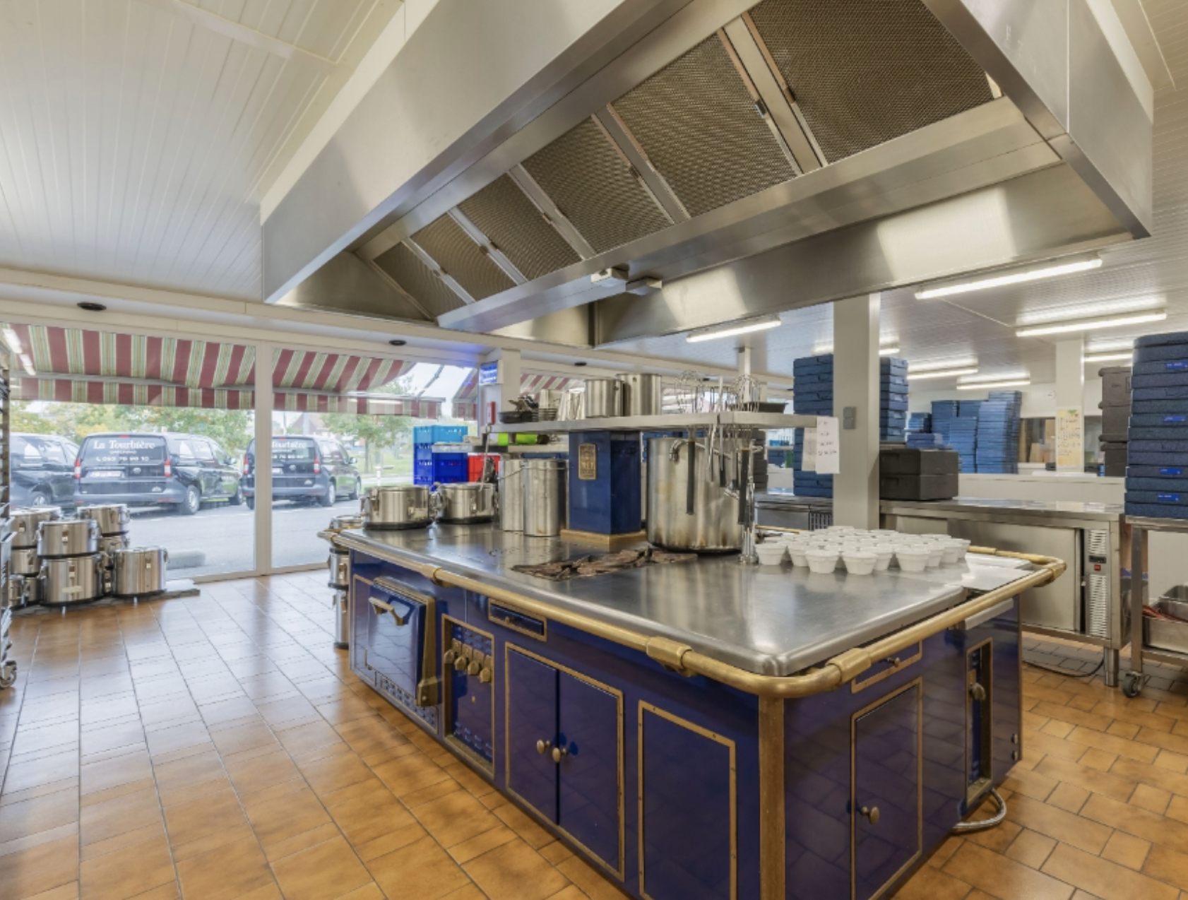 De zaak beschikt over een volledig ingerichte industriële keuken met topmateriaal, ideaal voor grootschalige bereidingen en professionele cateringactiviteiten.